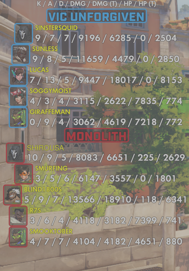 10 entries| Team | Player | Kills | Assists | Deaths | Damage | Damage (Taken) | Healing | Healing (Taken) |