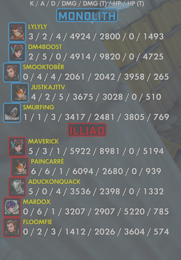 10 entries| Team | Player | Kills | Assists | Deaths | Damage | Damage (Taken) | Healing | Healing (Taken) |