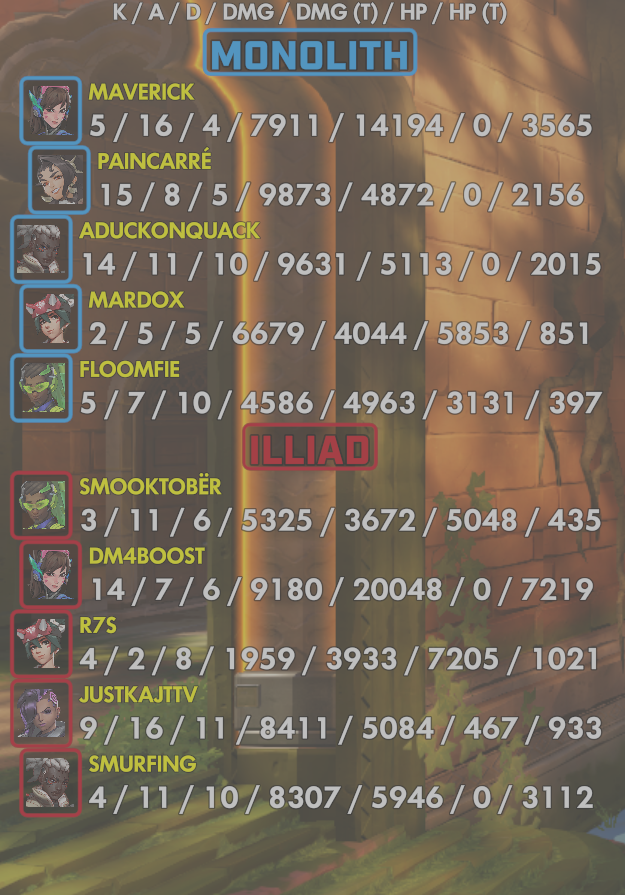 10 entries| Team | Player | Kills | Assists | Deaths | Damage | Damage (Taken) | Healing | Healing (Taken) |