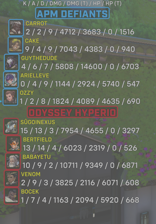 10 entries| Team | Player | Kills | Assists | Deaths | Damage | Damage (Taken) | Healing | Healing (Taken) |