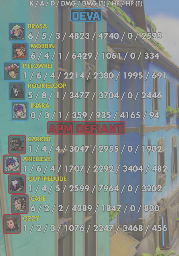 10 entries| Team | Player | Kills | Assists | Deaths | Damage | Damage (Taken) | Healing | Healing (Taken) |