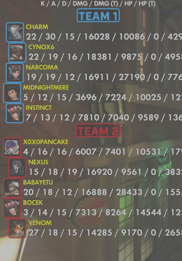 10 entries| Team | Player | Kills | Assists | Deaths | Damage | Damage (Taken) | Healing | Healing (Taken) |