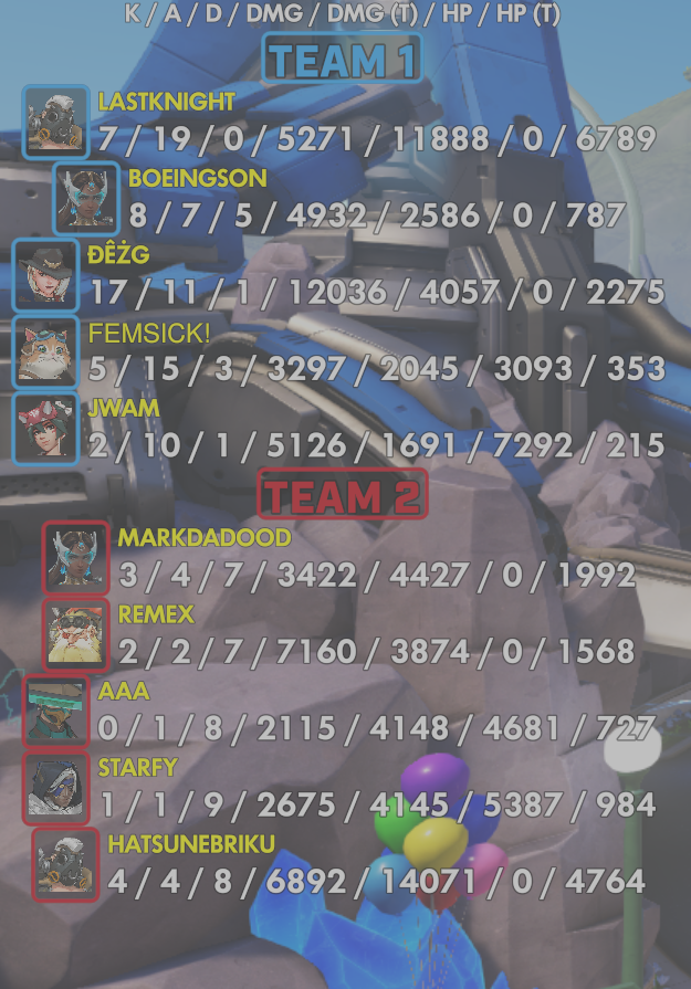 10 entries| Team | Player | Kills | Assists | Deaths | Damage | Damage (Taken) | Healing | Healing (Taken) |