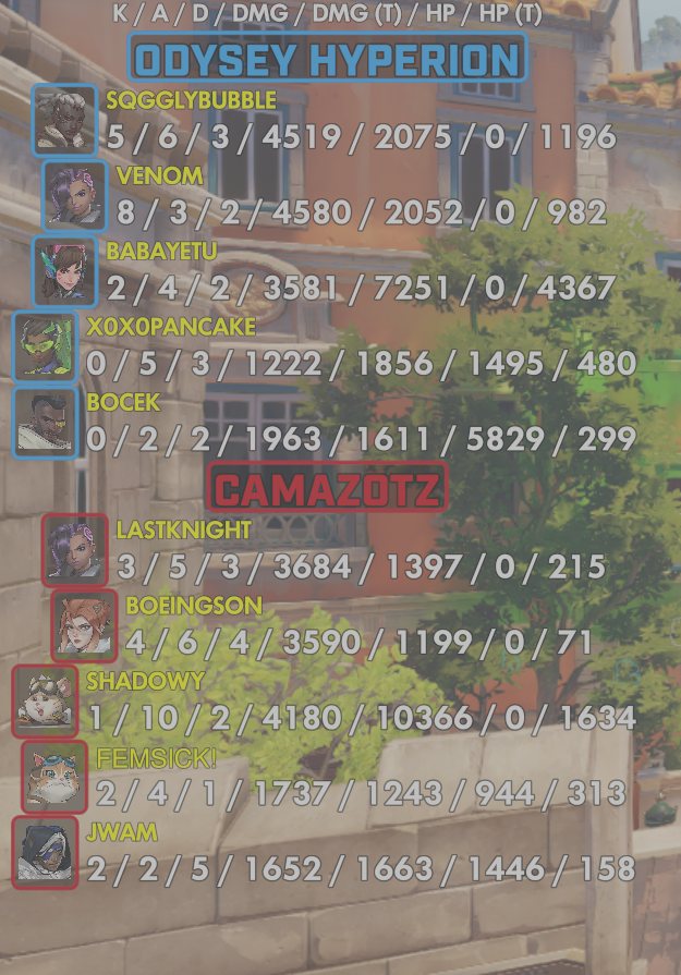 10 entries| Team | Player | Kills | Assists | Deaths | Damage | Damage (Taken) | Healing | Healing (Taken) |