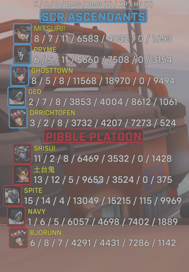 | Team | Player | Kills | Assists | Deaths | Damage | Damage (Taken) | Healing | Healing (Taken) |