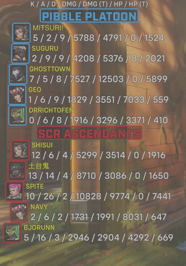 | Team | Player | Kills | Assists | Deaths | Damage | Damage (Taken) | Healing | Healing (Taken) |