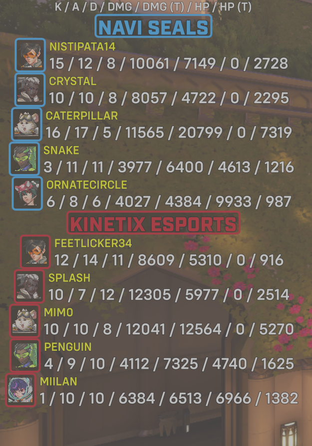 | Kinetix Esports | Unknown PlayerPlayer Most likely doesn't have their battletag updated on website | 10 | 10 | 8 | 12041 | 12564 | 0 | 5270 |