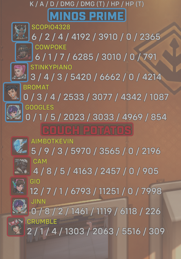 10 entries| Team | Player | Kills | Assists | Deaths | Damage | Damage (Taken) | Healing | Healing (Taken) |