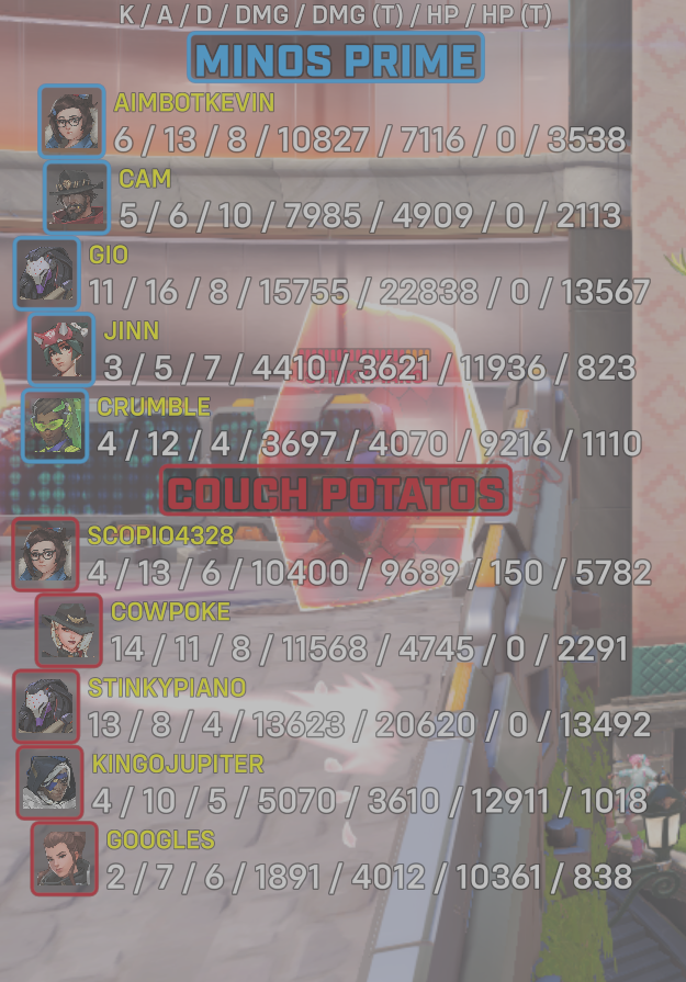 10 entries| Team | Player | Kills | Assists | Deaths | Damage | Damage (Taken) | Healing | Healing (Taken) |