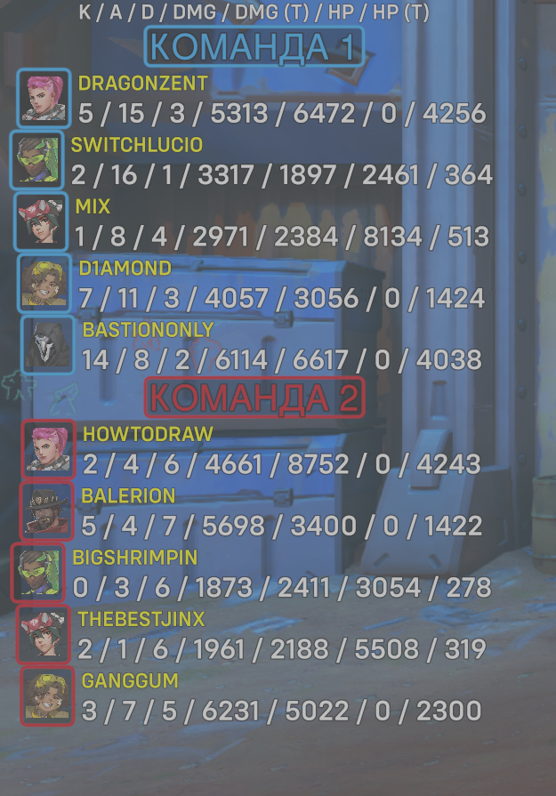 | Team | Player | Kills | Assists | Deaths | Damage | Damage (Taken) | Healing | Healing (Taken) |