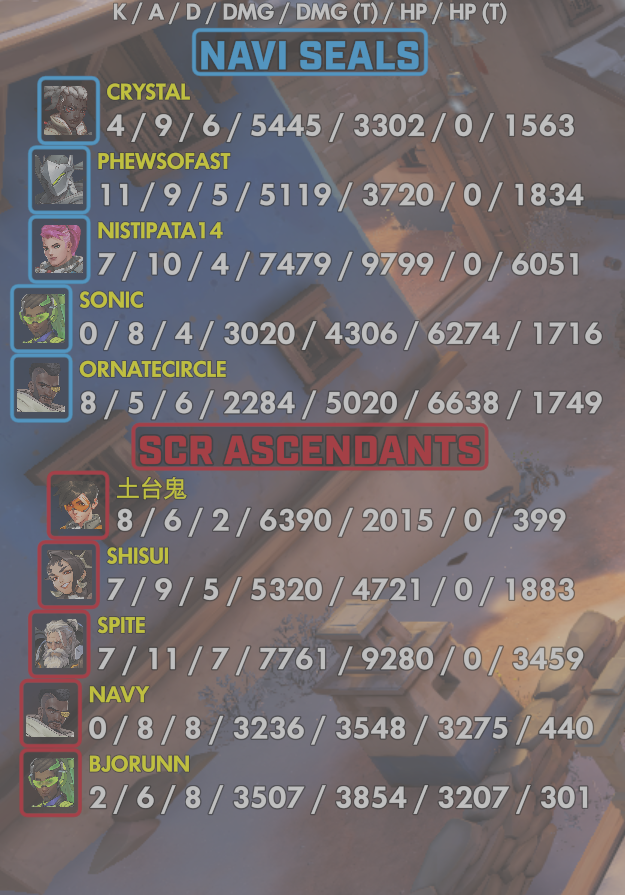 5 entries| Team | Player | Kills | Assists | Deaths | Damage | Damage (Taken) | Healing | Healing (Taken) |