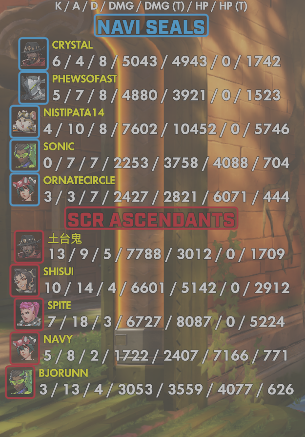 5 entries| Team | Player | Kills | Assists | Deaths | Damage | Damage (Taken) | Healing | Healing (Taken) |
