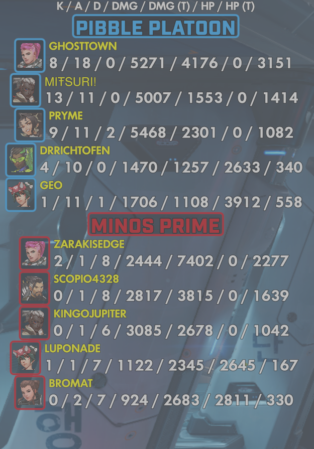 10 entries| Team | Player | Kills | Assists | Deaths | Damage | Damage (Taken) | Healing | Healing (Taken) |