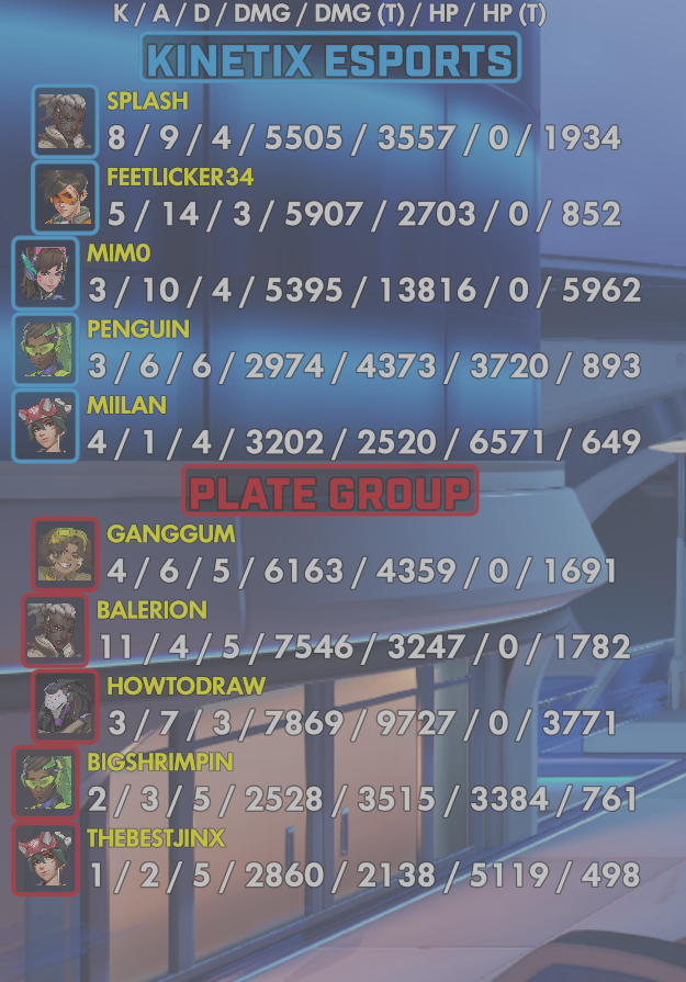 | Kinetix Esports | Unknown PlayerPlayer Most likely doesn't have their battletag updated on website | 3 | 10 | 4 | 5395 | 13816 | 0 | 5962 |