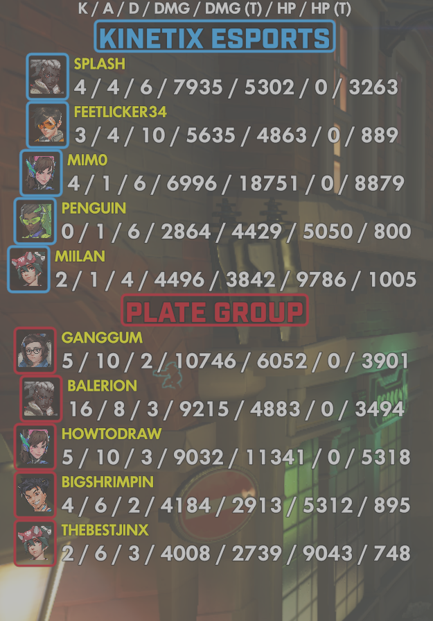 | Kinetix Esports | Unknown PlayerPlayer Most likely doesn't have their battletag updated on website | 4 | 1 | 6 | 6996 | 18751 | 0 | 8879 |