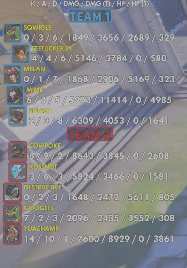10 entries| Team | Player | Kills | Assists | Deaths | Damage | Damage (Taken) | Healing | Healing (Taken) |