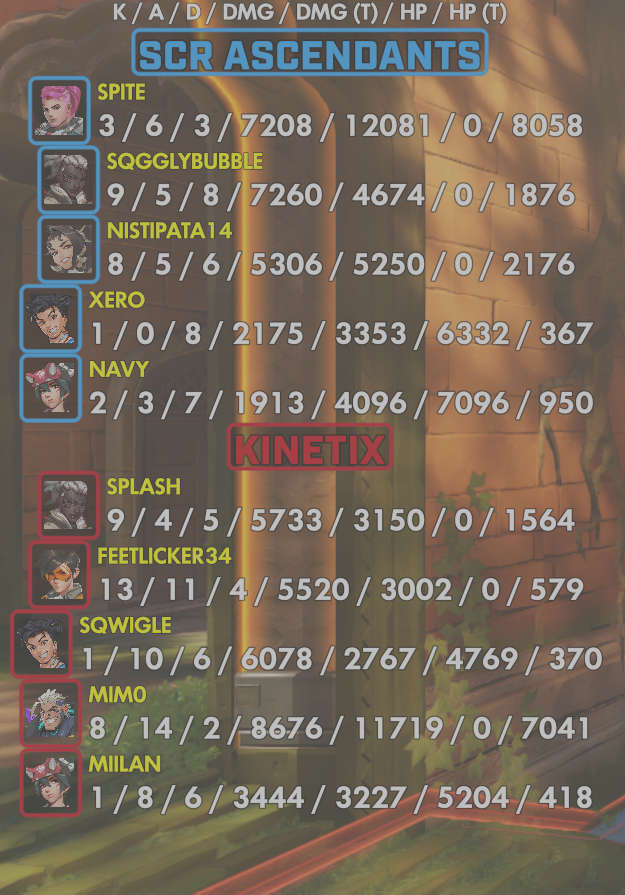10 entries| Team | Player | Kills | Assists | Deaths | Damage | Damage (Taken) | Healing | Healing (Taken) |