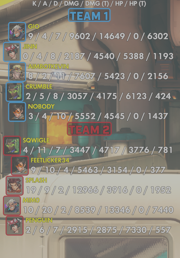 10 entries| Team | Player | Kills | Assists | Deaths | Damage | Damage (Taken) | Healing | Healing (Taken) |