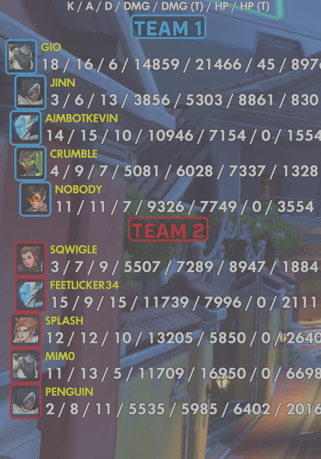 10 entries| Team | Player | Kills | Assists | Deaths | Damage | Damage (Taken) | Healing | Healing (Taken) |