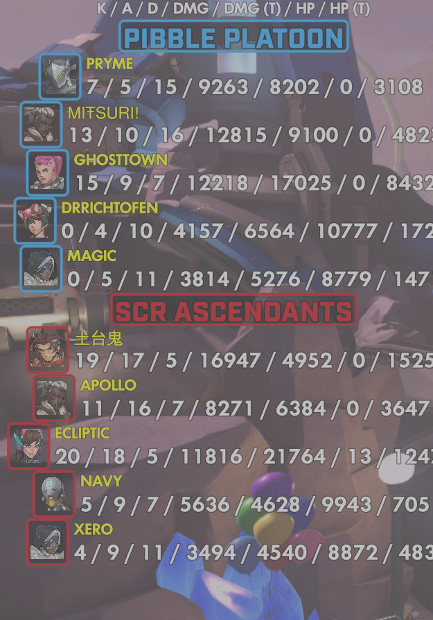 10 entries| Team | Player | Kills | Assists | Deaths | Damage | Damage (Taken) | Healing | Healing (Taken) |