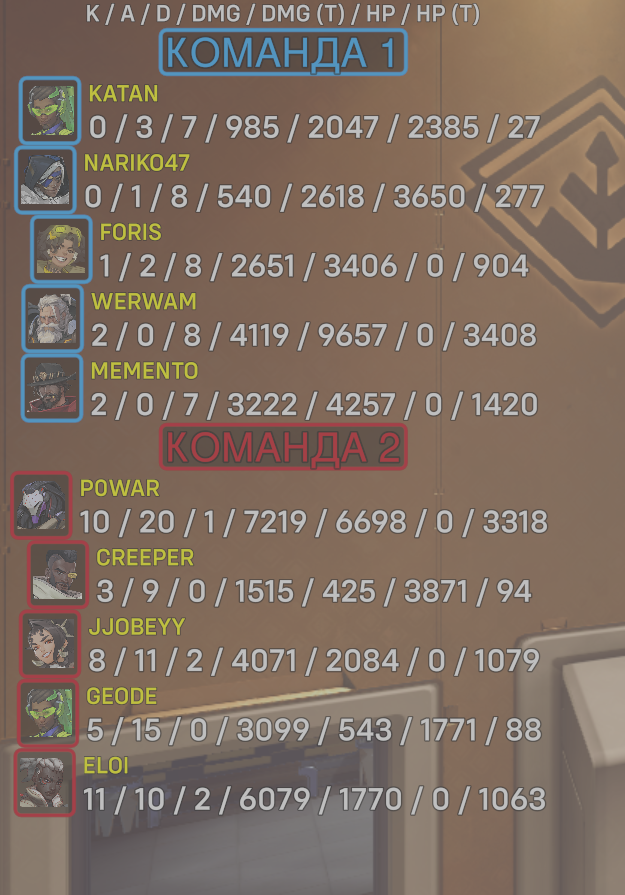 | Team | Player | Kills | Assists | Deaths | Damage | Damage (Taken) | Healing | Healing (Taken) |
