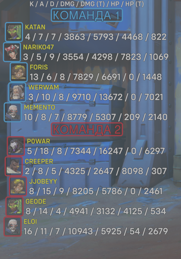 | Team | Player | Kills | Assists | Deaths | Damage | Damage (Taken) | Healing | Healing (Taken) |