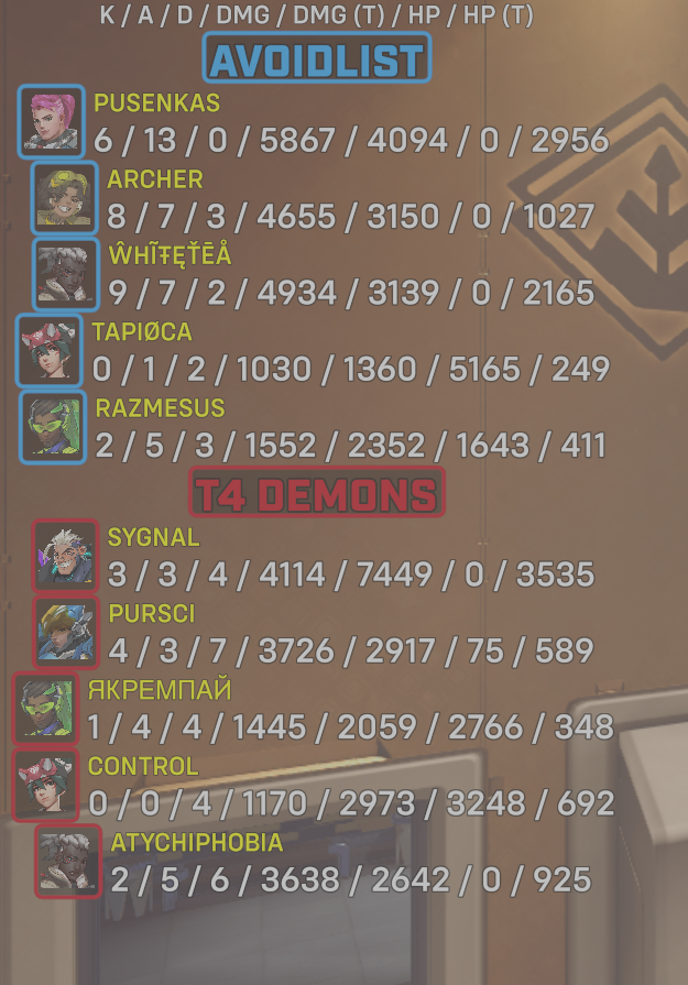 | AvoidList | Unknown PlayerPlayer Most likely doesn't have their battletag updated on website | 9 | 7 | 2 | 4934 | 3139 | 0 | 2165 |