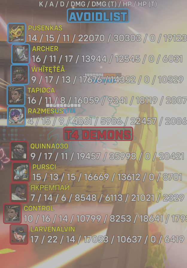 | T4 Demons | LarvenAlvin#2586 | 17 | 22 | 14 | 17053 | 10637 | 0 | 6419 |