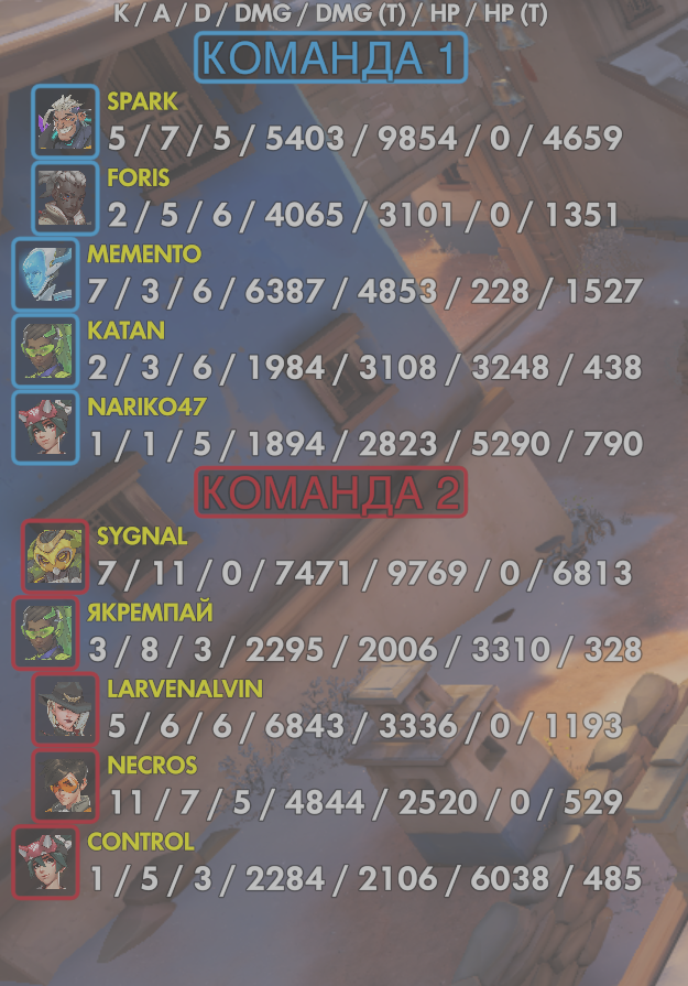 | Team | Player | Kills | Assists | Deaths | Damage | Damage (Taken) | Healing | Healing (Taken) |