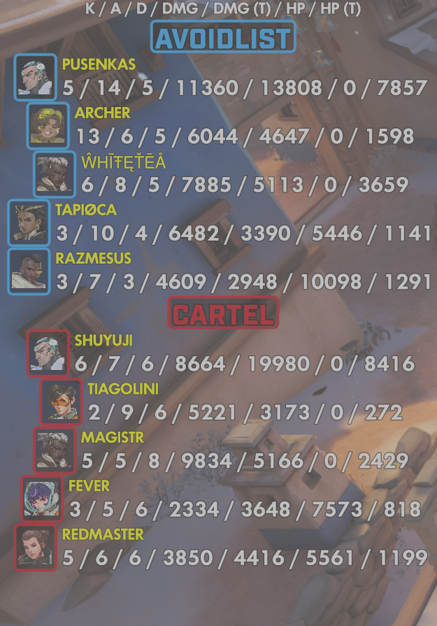 | Cartel | ShuYuji#2253 | 6 | 7 | 6 | 8664 | 19980 | 0 | 8416 |
