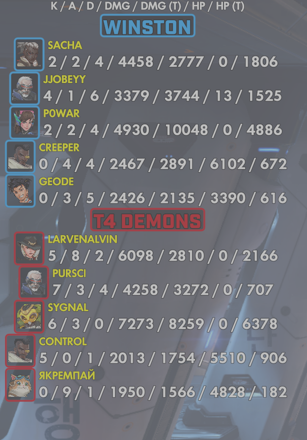 | Team | Player | Kills | Assists | Deaths | Damage | Damage (Taken) | Healing | Healing (Taken) |