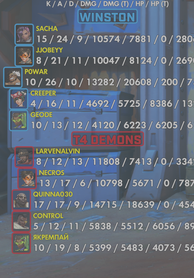 | T4 Demons | LarvenAlvin#2586 | 8 | 12 | 13 | 11808 | 7413 | 0 | 3349 |