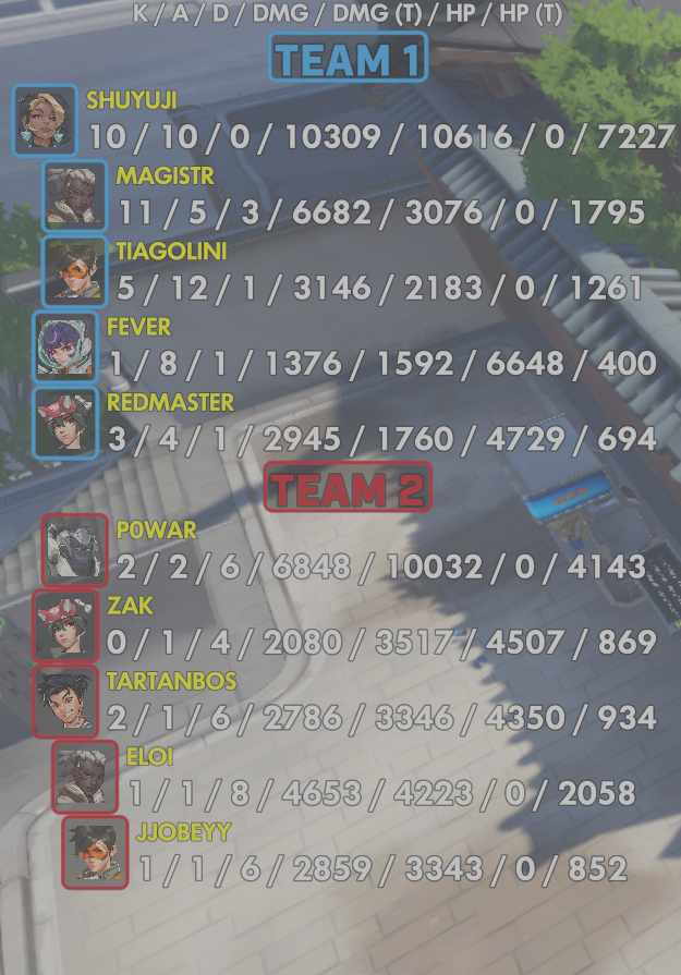 6 entries| Team | Player | Kills | Assists | Deaths | Damage | Damage (Taken) | Healing | Healing (Taken) |