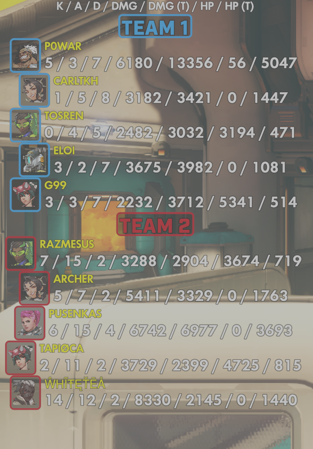 9 entries| Team | Player | Kills | Assists | Deaths | Damage | Damage (Taken) | Healing | Healing (Taken) |