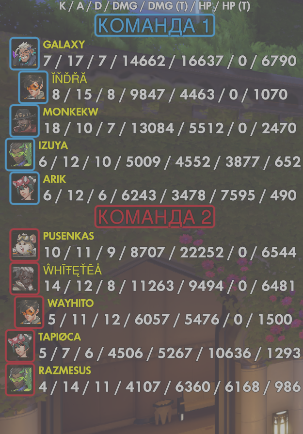 10 entries| Team | Player | Kills | Assists | Deaths | Damage | Damage (Taken) | Healing | Healing (Taken) |