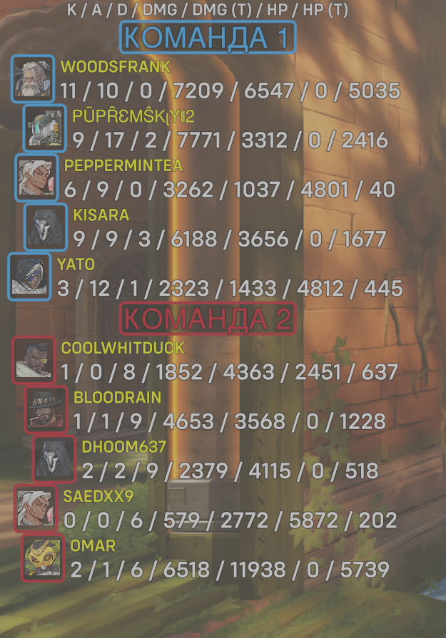 10 entries| Team | Player | Kills | Assists | Deaths | Damage | Damage (Taken) | Healing | Healing (Taken) |
