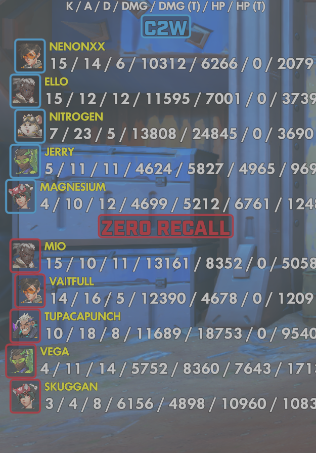 | Team | Player | Kills | Assists | Deaths | Damage | Damage (Taken) | Healing | Healing (Taken) |