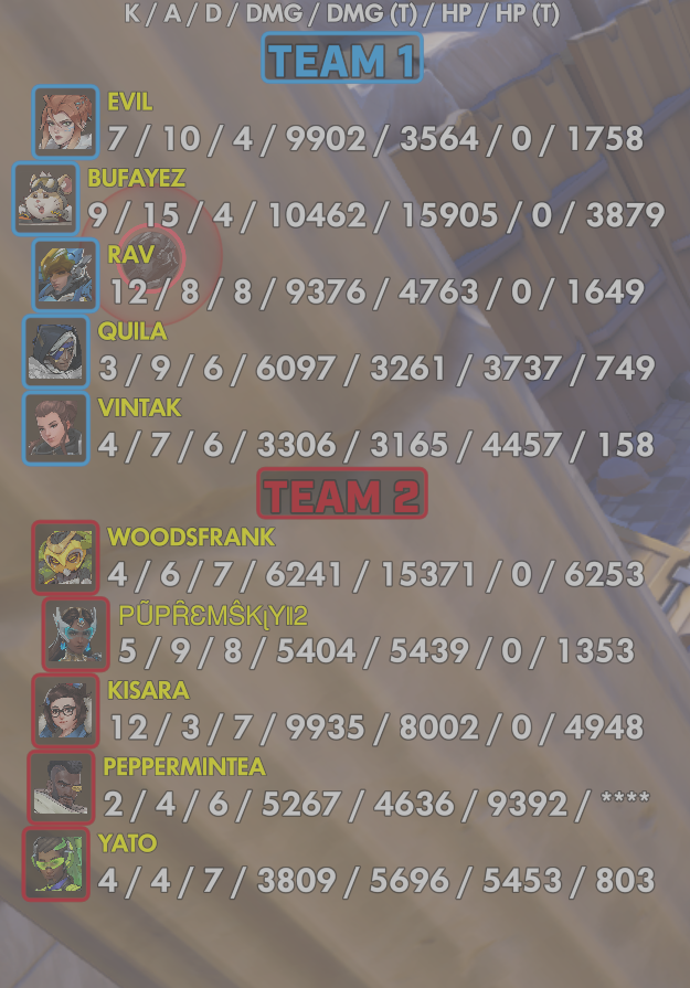 | Team | Player | Kills | Assists | Deaths | Damage | Damage (Taken) | Healing | Healing (Taken) |