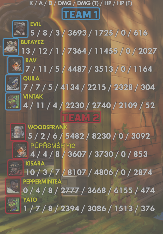 | Team | Player | Kills | Assists | Deaths | Damage | Damage (Taken) | Healing | Healing (Taken) |