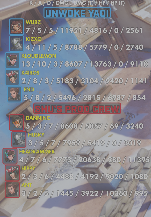 10 entries| Team | Player | Kills | Assists | Deaths | Damage | Damage (Taken) | Healing | Healing (Taken) |
