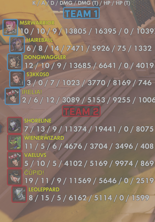 10 entries| Team | Player | Kills | Assists | Deaths | Damage | Damage (Taken) | Healing | Healing (Taken) |