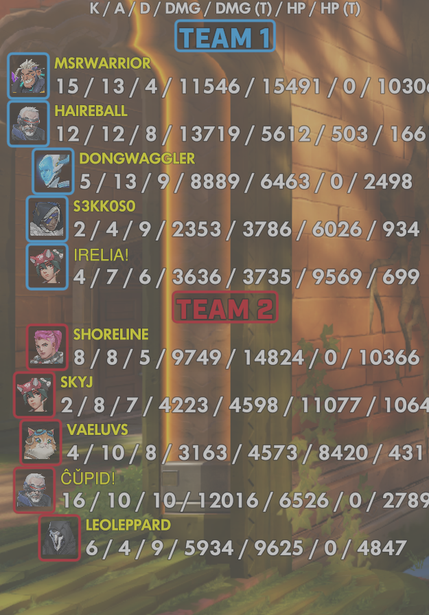 10 entries| Team | Player | Kills | Assists | Deaths | Damage | Damage (Taken) | Healing | Healing (Taken) |