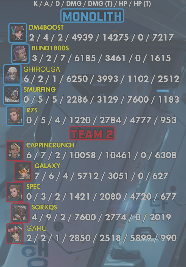 10 entries| Team | Player | Kills | Assists | Deaths | Damage | Damage (Taken) | Healing | Healing (Taken) |