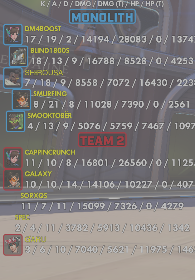 10 entries| Team | Player | Kills | Assists | Deaths | Damage | Damage (Taken) | Healing | Healing (Taken) |