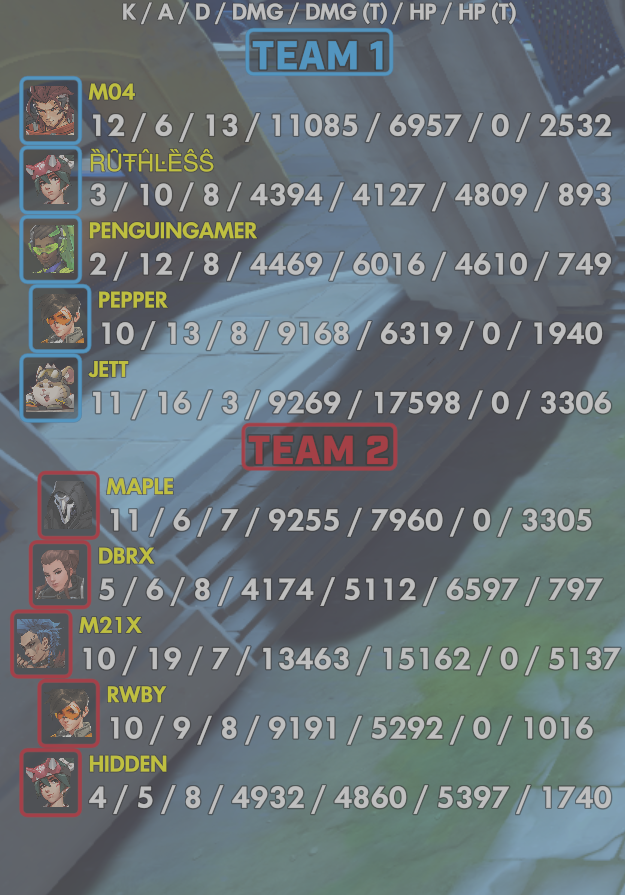 10 entries| Team | Player | Kills | Assists | Deaths | Damage | Damage (Taken) | Healing | Healing (Taken) |