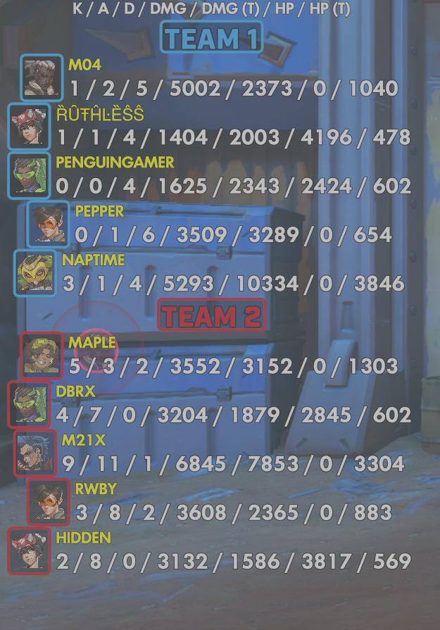 10 entries| Team | Player | Kills | Assists | Deaths | Damage | Damage (Taken) | Healing | Healing (Taken) |