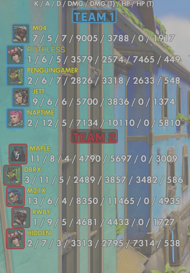 10 entries| Team | Player | Kills | Assists | Deaths | Damage | Damage (Taken) | Healing | Healing (Taken) |