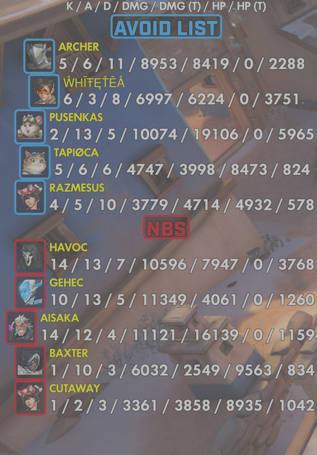10 entries| Team | Player | Kills | Assists | Deaths | Damage | Damage (Taken) | Healing | Healing (Taken) |