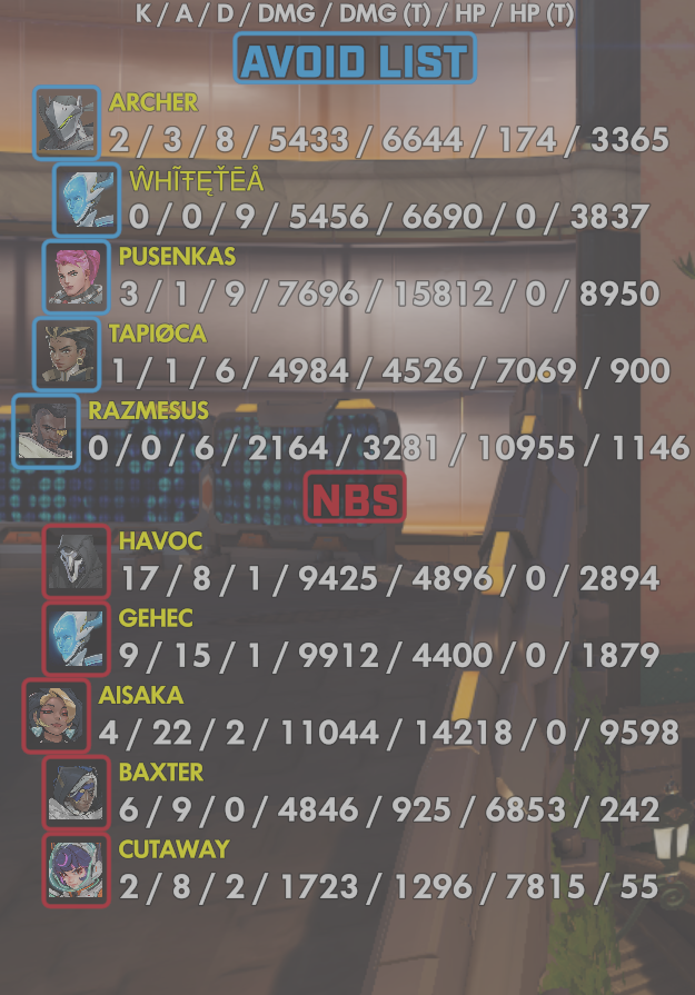 5 entries| Team | Player | Kills | Assists | Deaths | Damage | Damage (Taken) | Healing | Healing (Taken) |