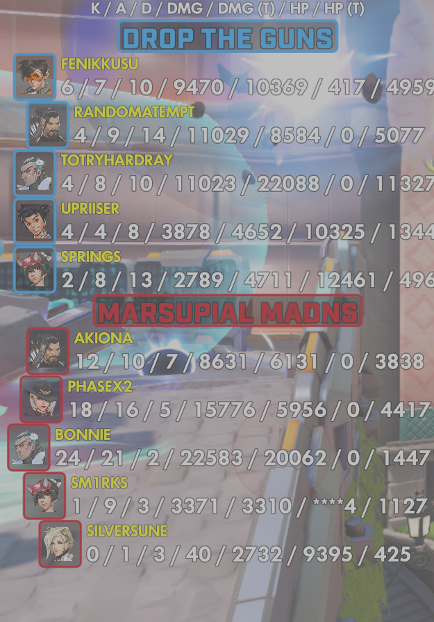 10 entries| Team | Player | Kills | Assists | Deaths | Damage | Damage (Taken) | Healing | Healing (Taken) |